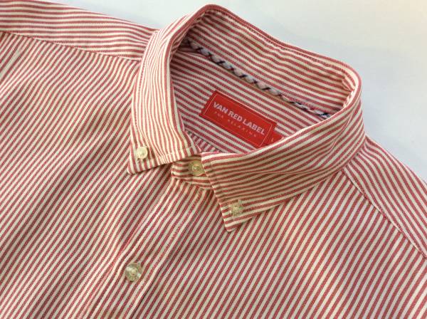 | 商品の特徴 | VAN RED LABEL BDオックスフォードアイビーシャツ 未使用新品の出品です。タグはありません。サイズ表示はL 実寸は着丈約76cm 身幅約54cmです。素材は綿100になります。すべてのボタンにVAN RED LABELの刻印があります。バックはハンガーループ ボックスプリーツ仕様です。未使用新品ですが保管上の多少のスレ シワはご容赦下さい。NC NRでお願い致します。鮮やかなロンドンストライプ柄がこの春から夏にかけて映える逸品です。発送は定形外郵便 ゆうパックなどを予定しています。カラーは画像2は明るい感じで写っていますが一番近いカラーは画像1と3です。